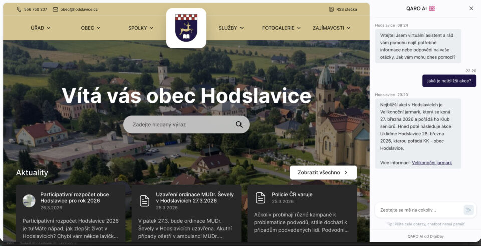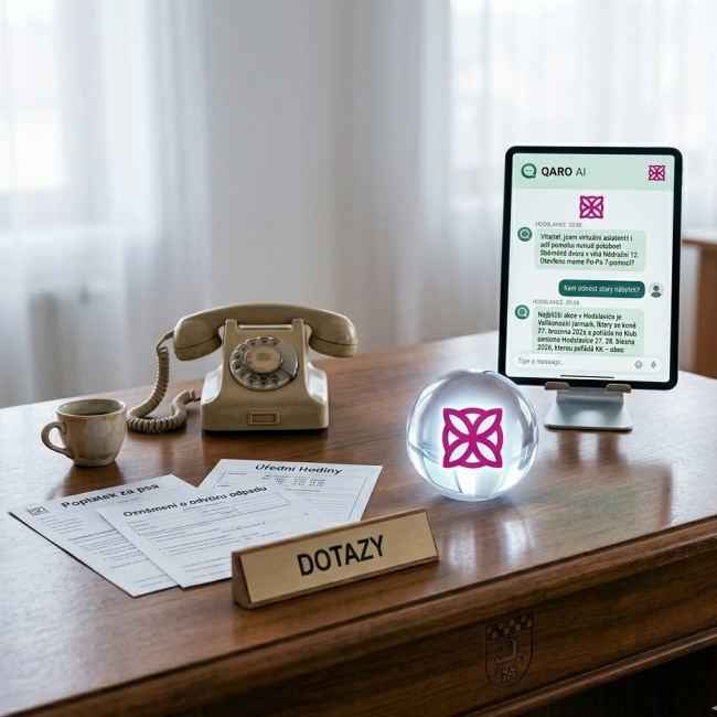 Obecní úřad není call centrum. Přesto podstatnou část jeho agendy tvoří odpovídání na otázky, které jsou dávno zveřejněné na obecním webu. Problém není v ochotě úředníků — problém je v tom, že běžný web neumí aktivně komunikovat. Čeká, až si občan informaci najde sám.